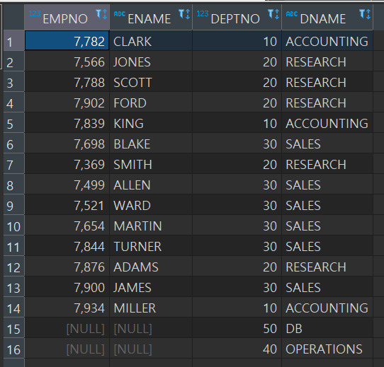 위에 데이터를 보면, EMP 테이블에 DEPT 테이블의 데이터중 없는게 있으므로, EMP 테이블에 (+) 를 붙여준다.